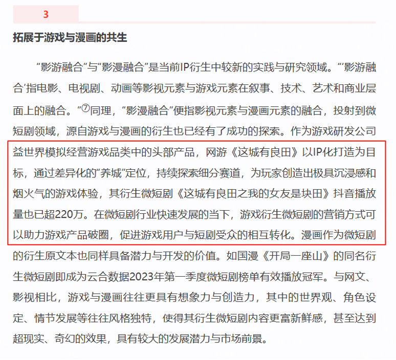 (5)益世界旗下手游《这城有良田》同名短剧——《这城有良田之我的女友是块田》作为“游戏+短剧”融合创新案例被纳入研究
