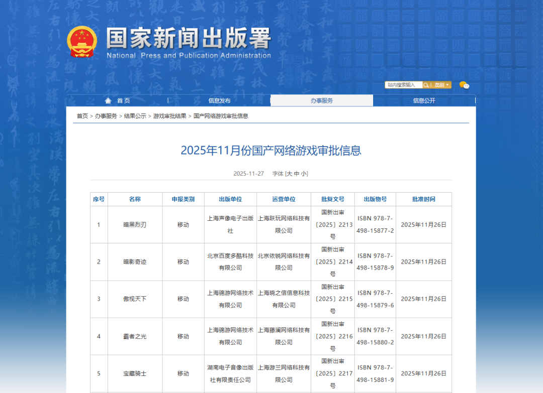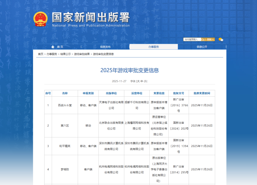 11月27日,国家新闻出版署新公布了7款游戏的审批变更信息。
