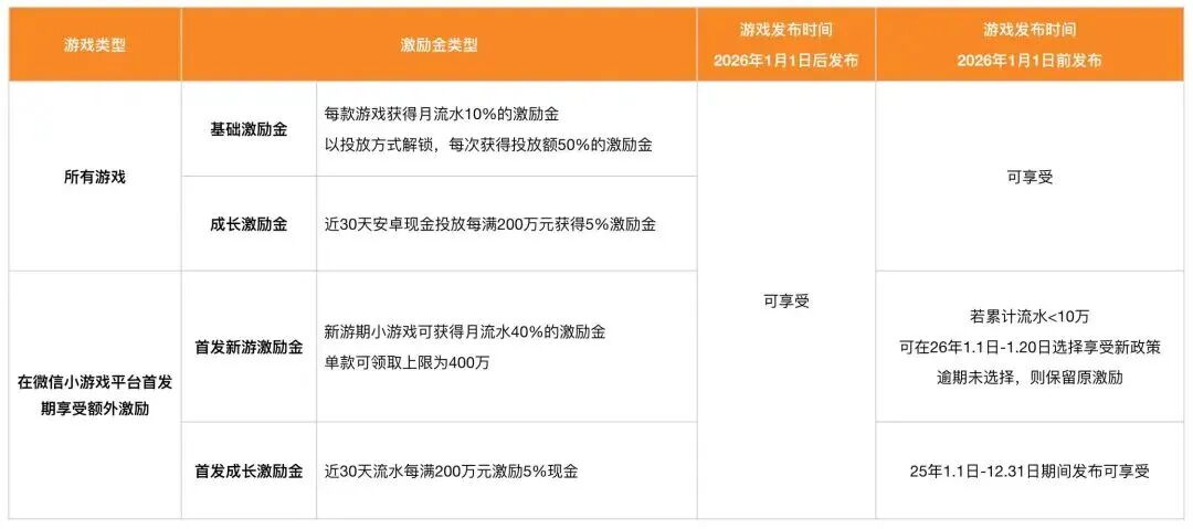 新游期激励金增发160万,单款游戏可获得的激励金上限调高至400万(2026年上半年),并取消单月上限;